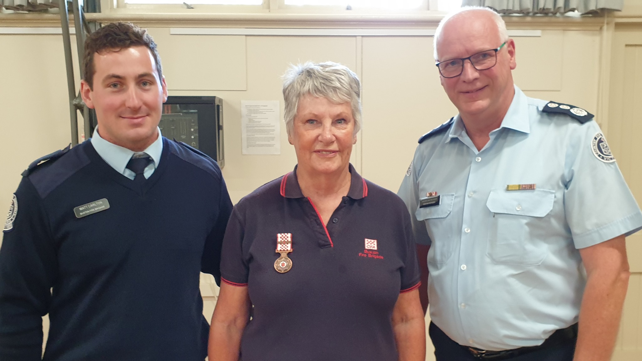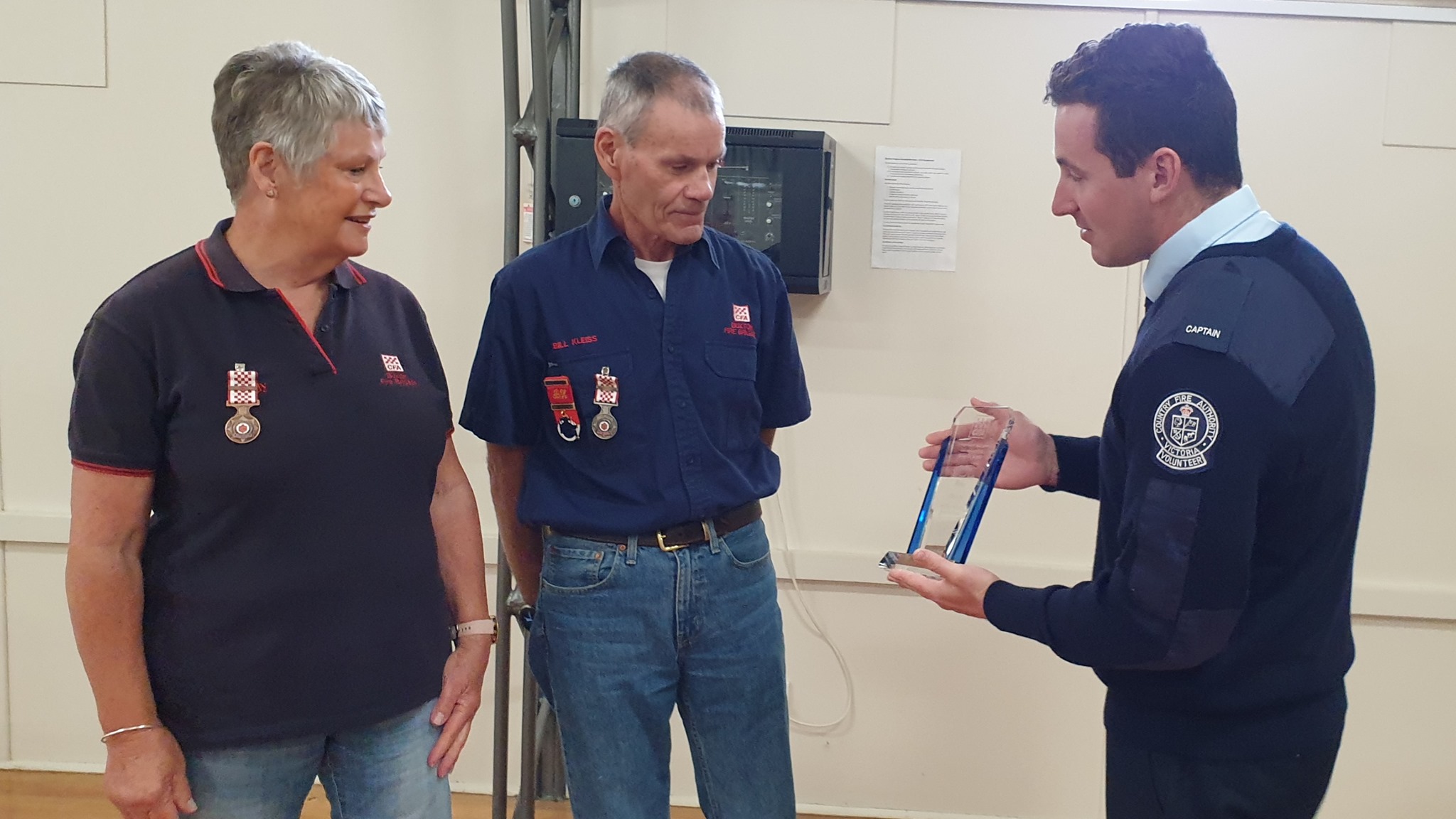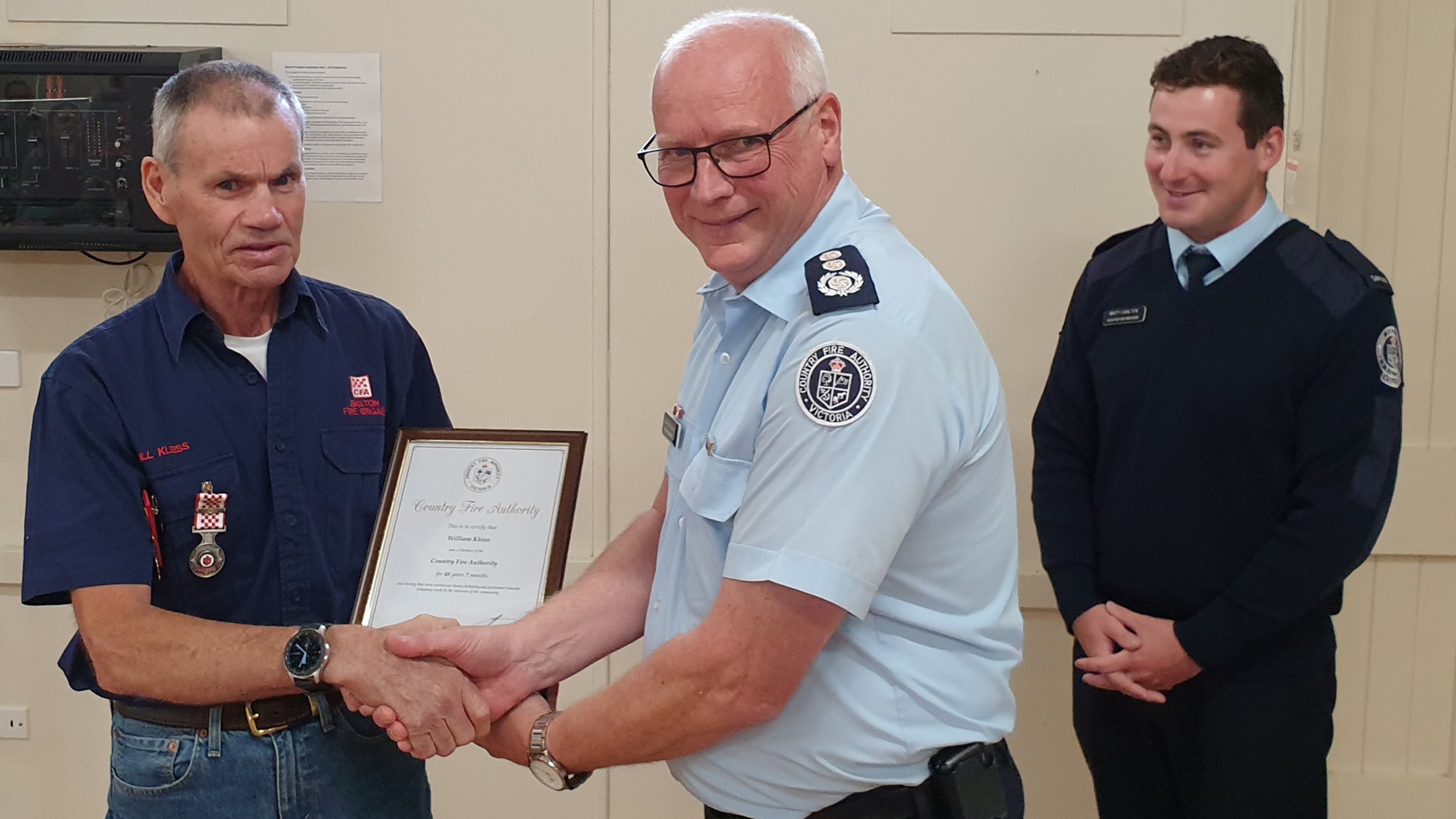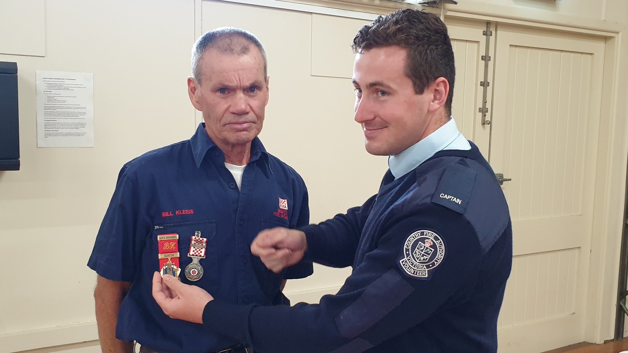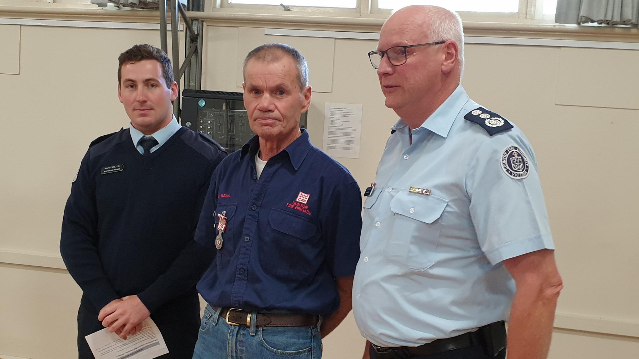 Captain Carlton read a short precise of their service to three communities and, specifically, the impact they have had on the Buxton Fire Brigade. Matt presented Bill with Life Membership of the brigade in recognition of the extraordinary contribution he has made during his time at Buxton. In 2019, Bill was also recognised by Shoreham with Life Membership of that brigade.