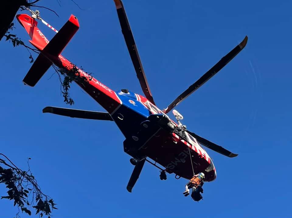 Marysville and Buxton CFA members assisted the CFA and FRV Rope Rescue Crews in staging equipment on Canyon Track. Fortunately, AV was able to stabilise the patient for a winch by HEMS1.