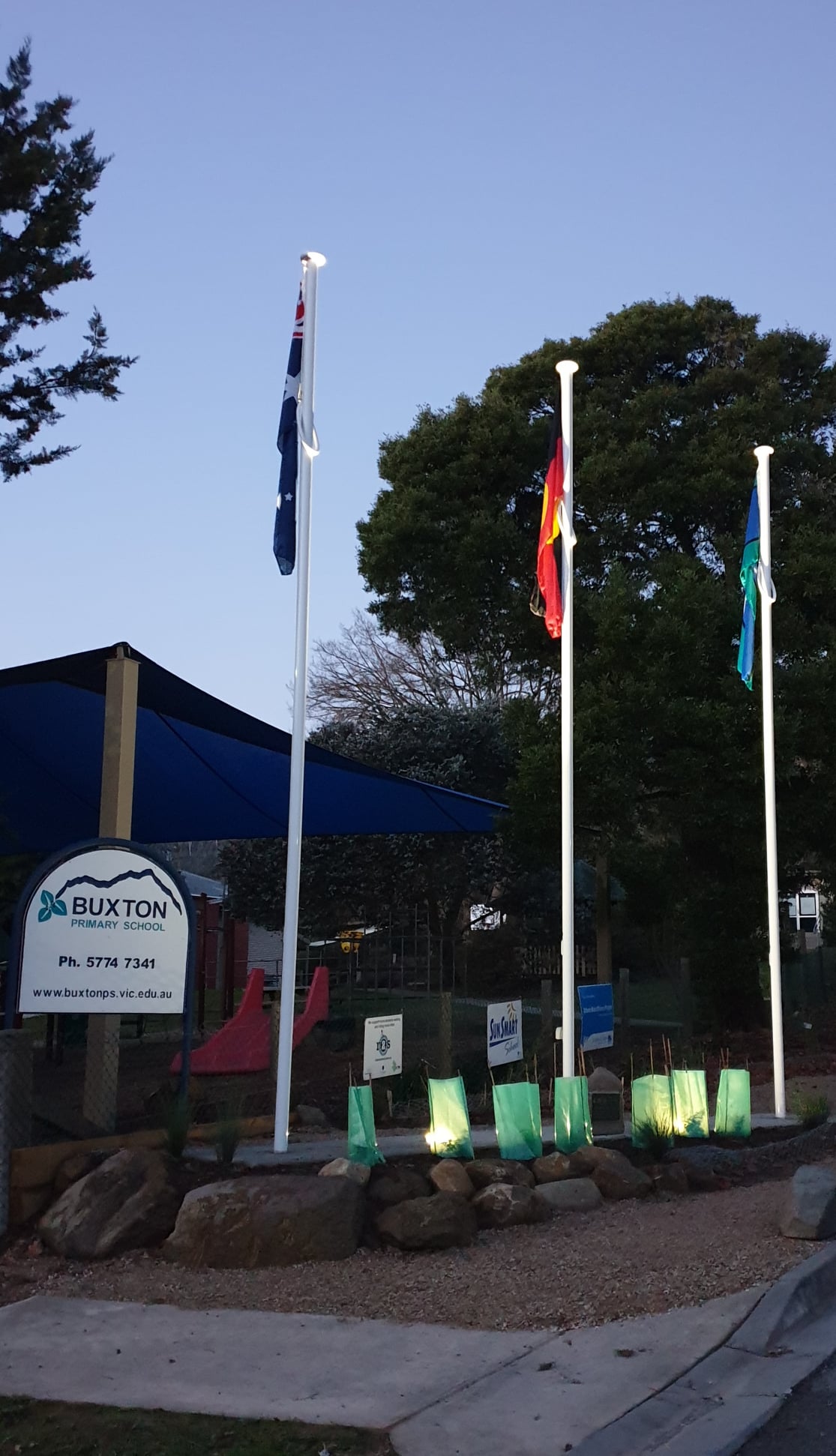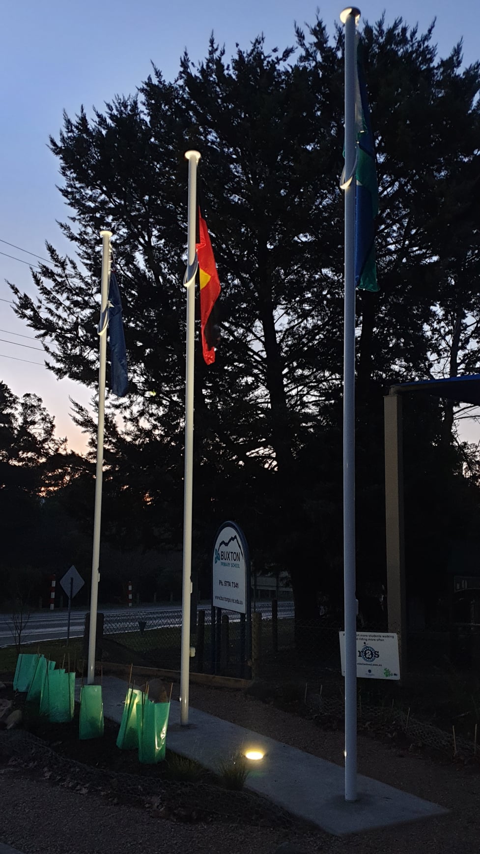 Thanks to the work of some very dedicated members of our small community, the electrical work associated with the new flagpoles at the Buxton Memorial Hall was completed this afternoon and, as of tonight, the new flags are flying illuminated from below.