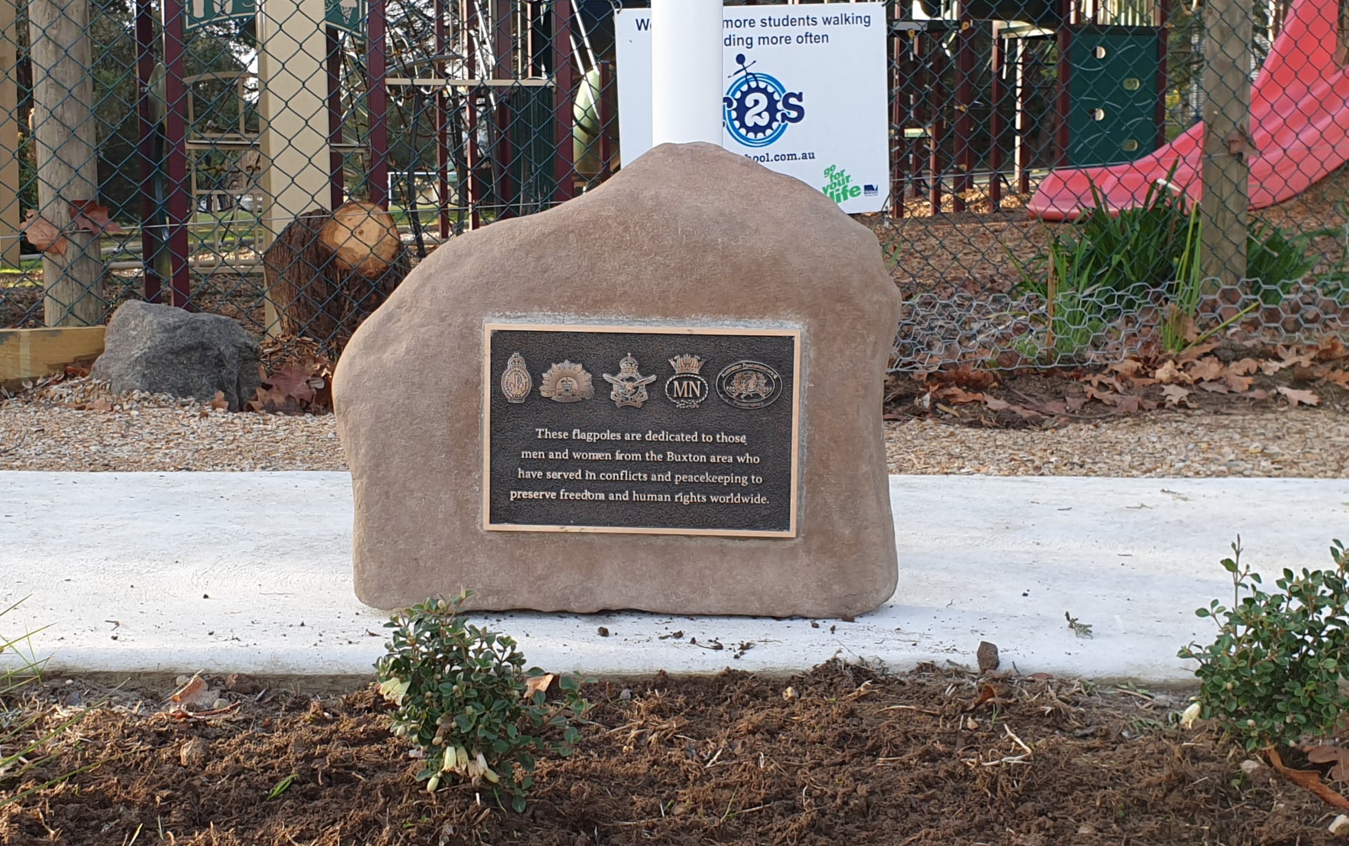 Earlier in the week, the dedication plaque was installed at the base of the flagpoles. The stone on which the plaque is mounted was sourced from a local farm courtesy of a brigade member. The new flagpoles are dedicated to those men and women from the Buxton area who have served in conflicts and peacekeeping to preserve freedom and human rights worldwide.