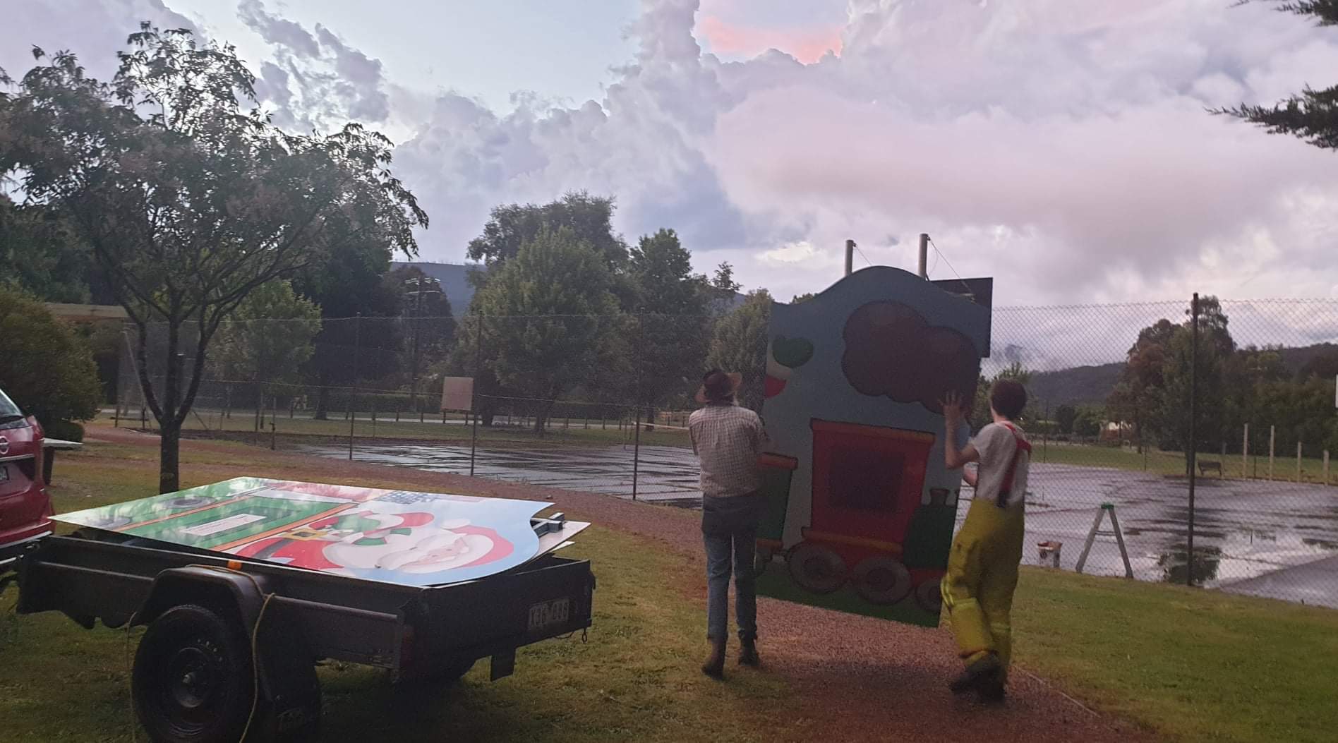 Once the initial storm had passed we decided to push on and make a start; just to have the pagers go off for a fire call in Marysville. While the operational members bolted over to the station, the others headed up to the Buxton Memorial Hall to collect the decorations. Fortunately the call to Marysville was a false alarm and everyone joined up at the hall to get the panels loaded.