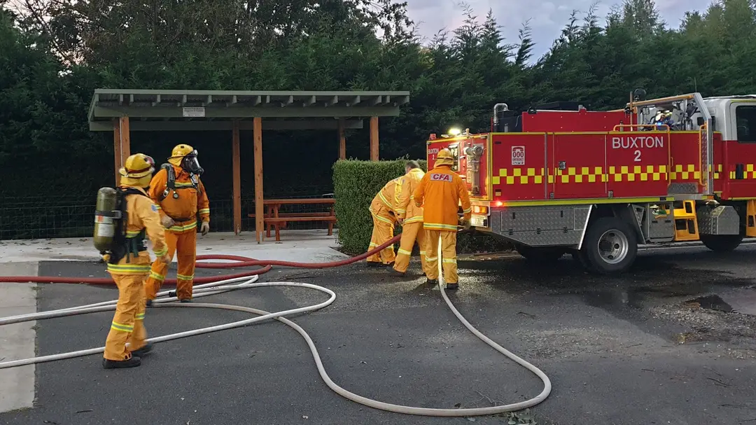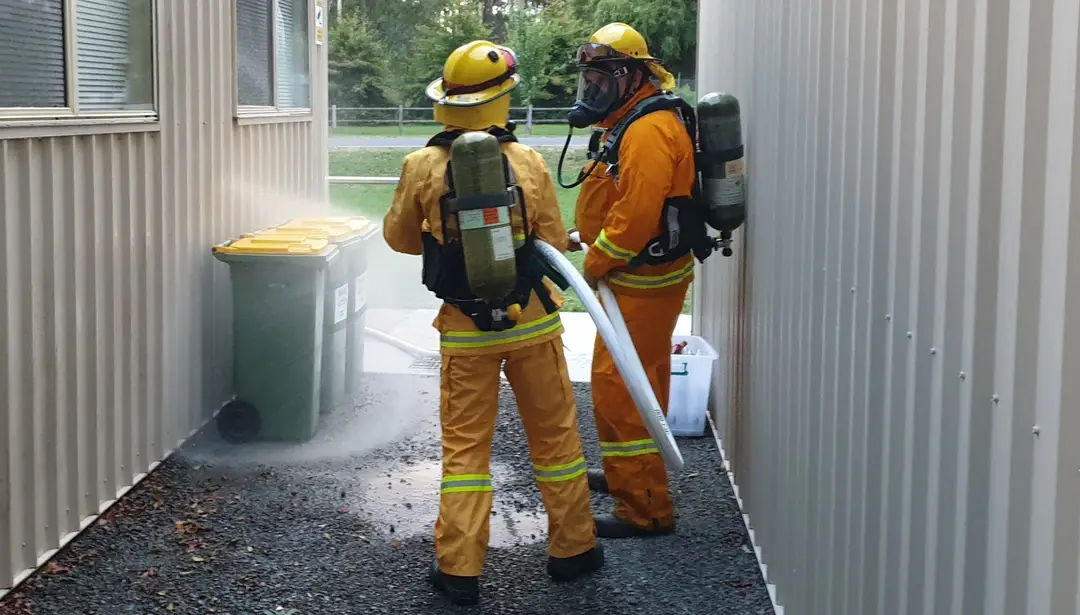 The CABA trainees tonight comprised a member from Buxton and a member from the Acheron brigade. The crews were set a scenario where a couple of rubbish bins were on fire at the rear of a commercial property. Tanker 2 had arrived first followed by Tanker 1 with the breathing apparatus crew.