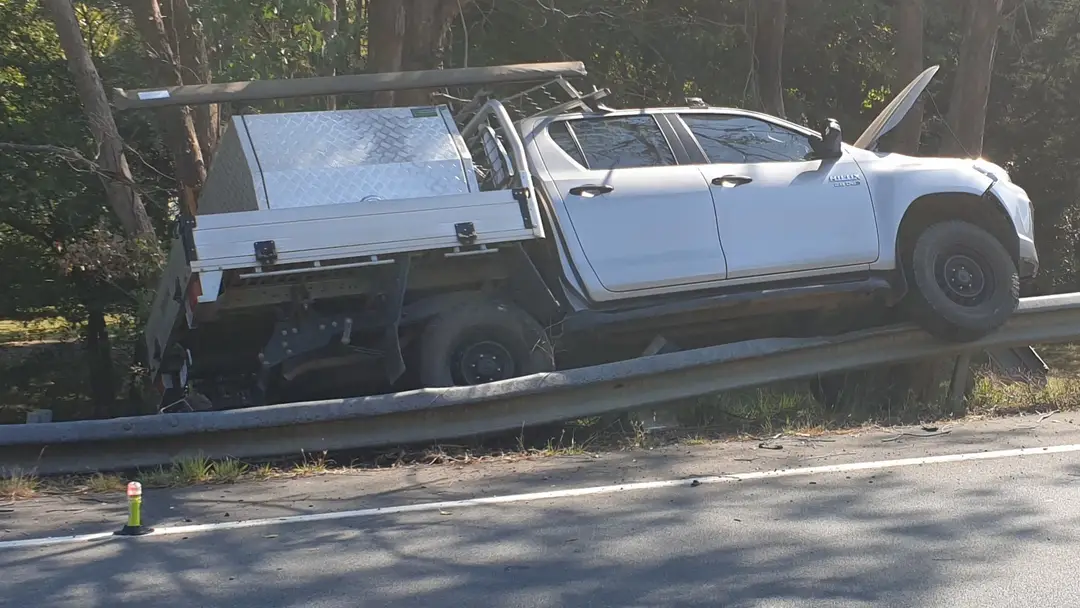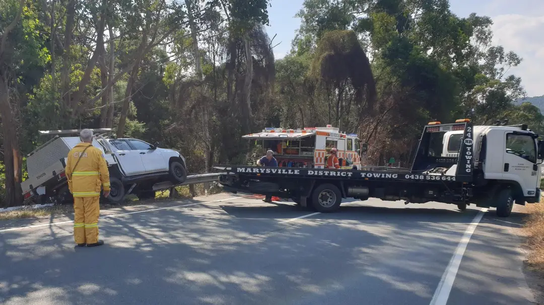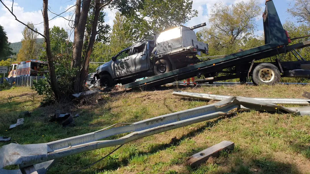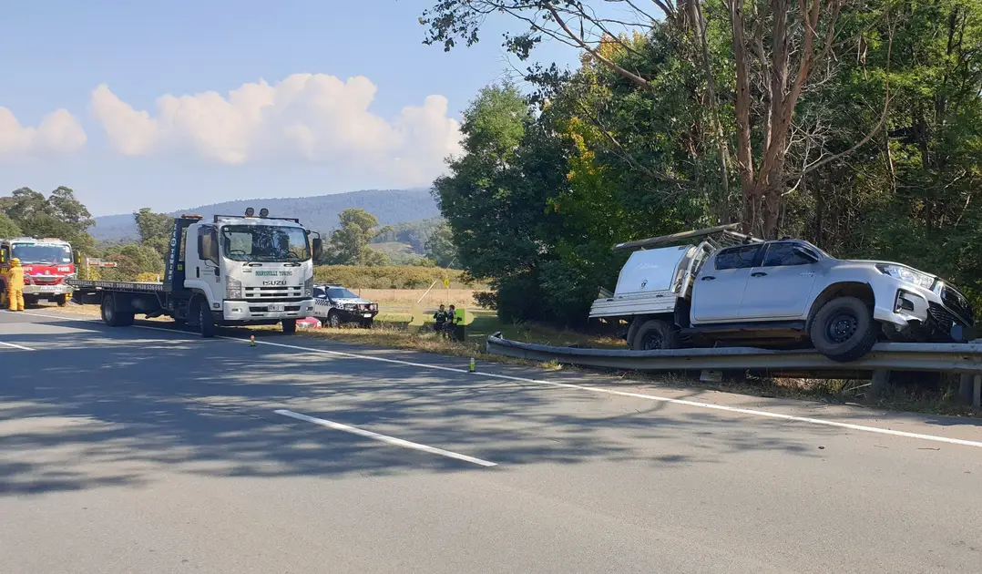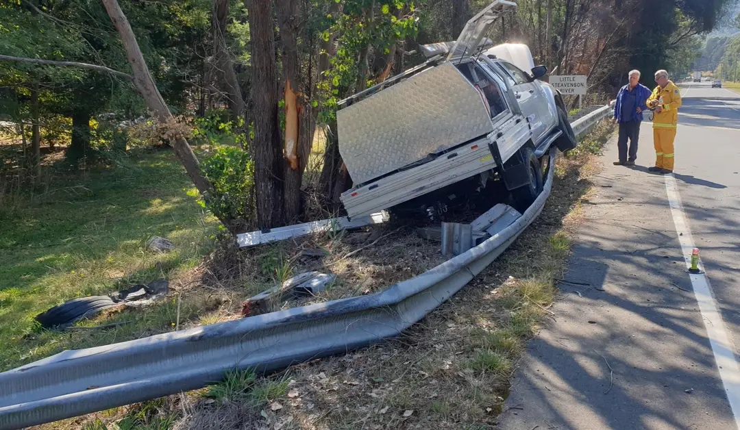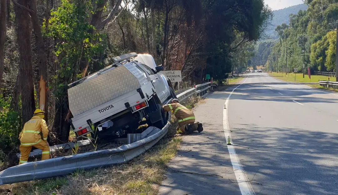 This afternoon, at 12:20pm, the brigade was responded to a motor vehicle accident on Maroondah Highway near the Little Steavenson River bridge. A vehicle had left the road just after the Dyes Lane intersection and collided with a tree after impacting the armco safety rail. The vehicle came to rest on top of the damaged armco rail.