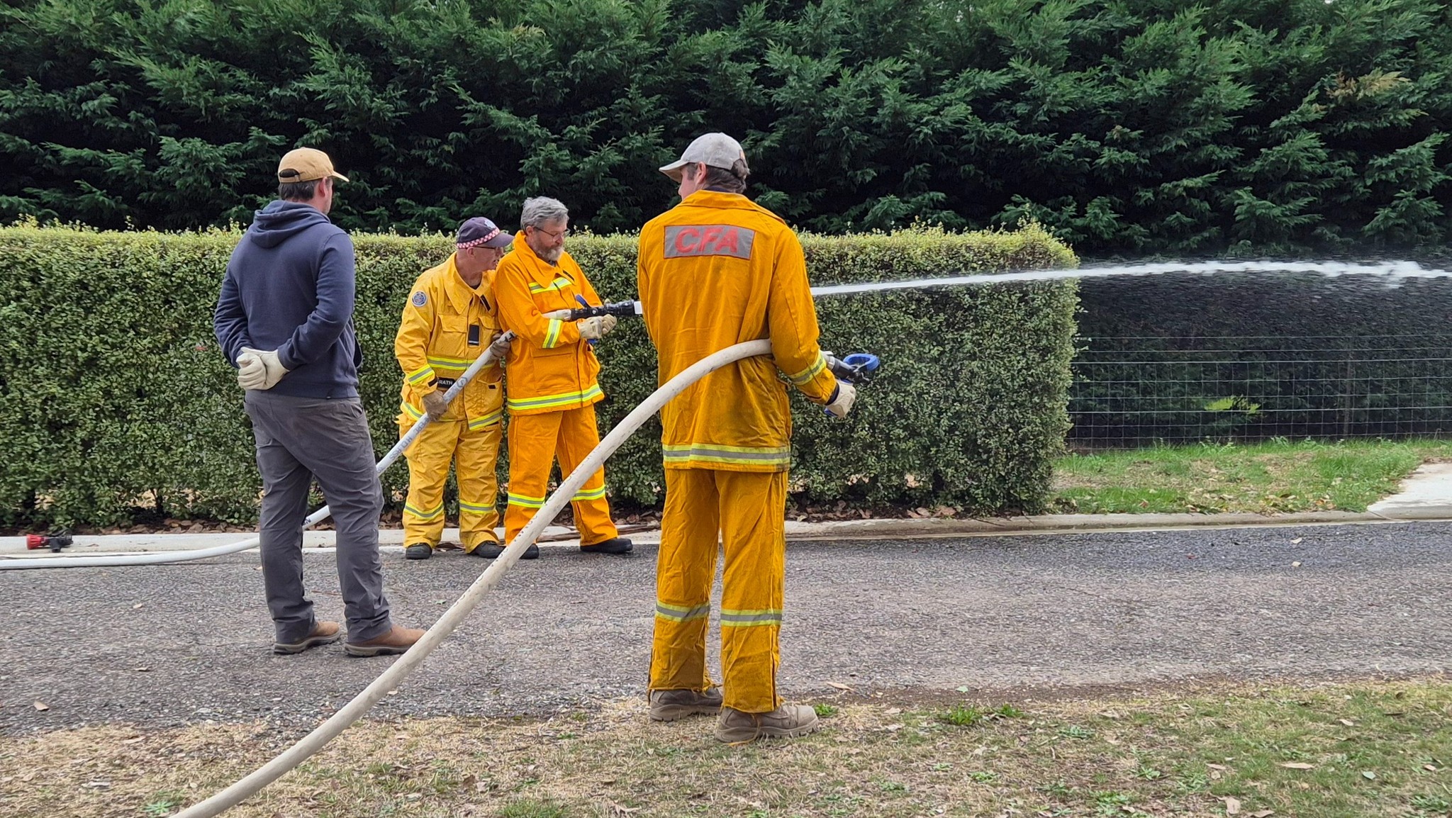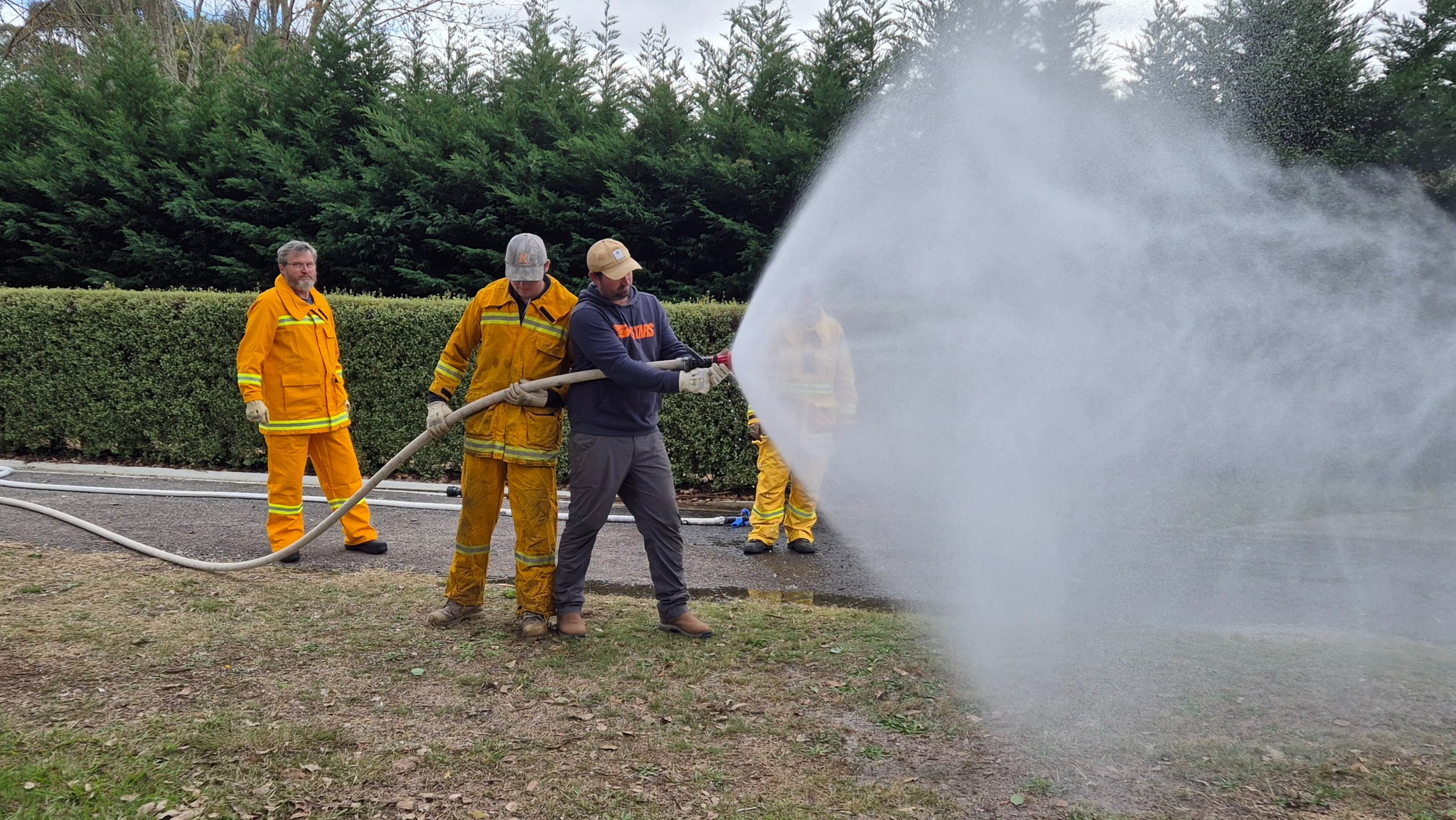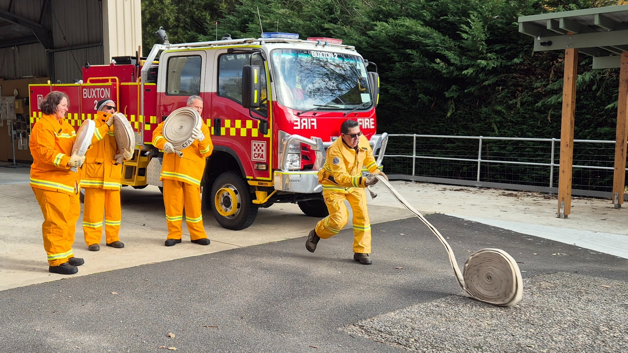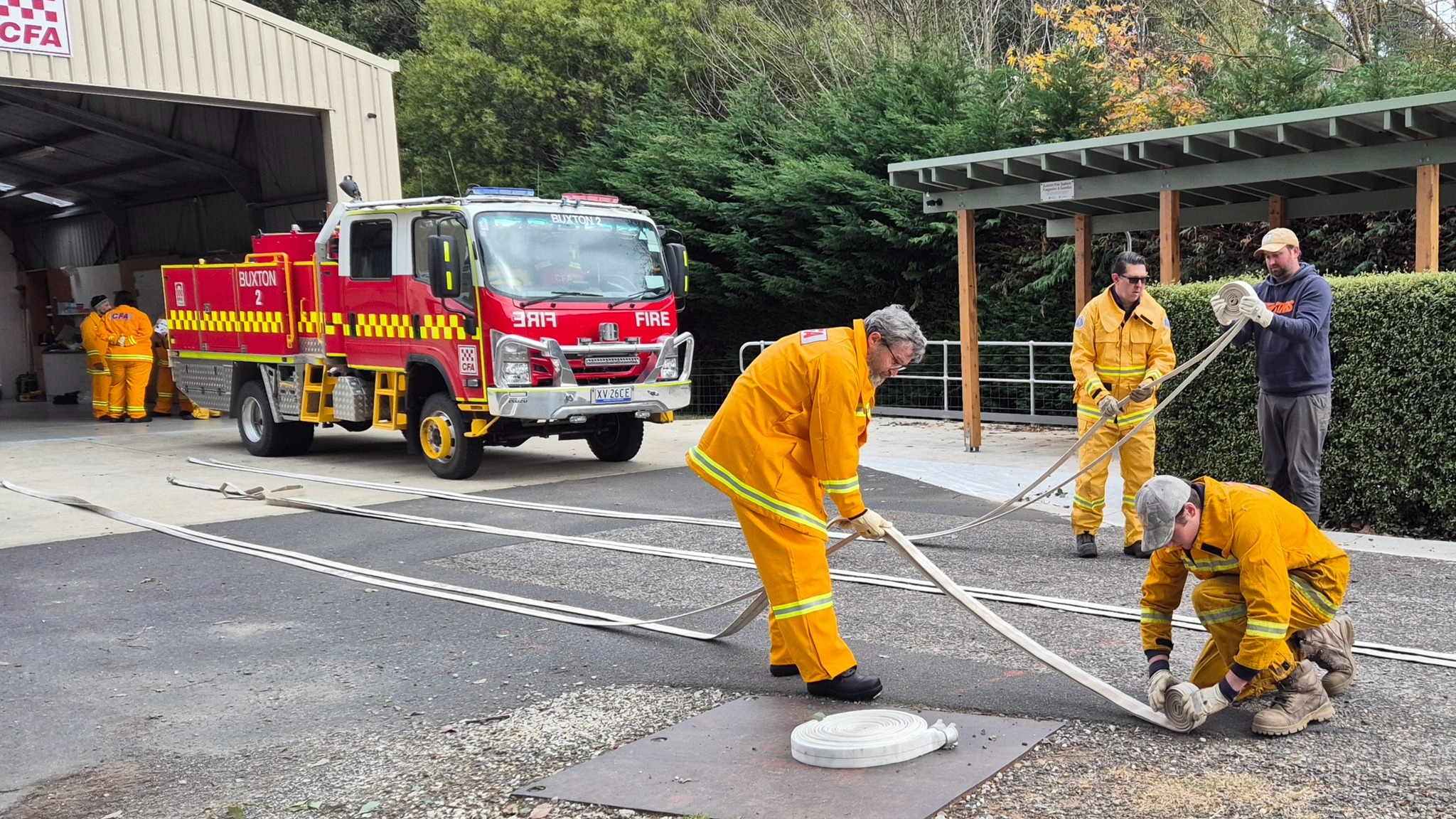 The recruits (some of whom are still in the process of being allocated their bushfire protective clothing) completed drills on radio operations, hose deployment, water delivery, and pump operations. This morning was one of three practical sessions offered, as part of the block course, to cover the mandatory practical drills and brigade familiarisation tasks in a group learning environment.