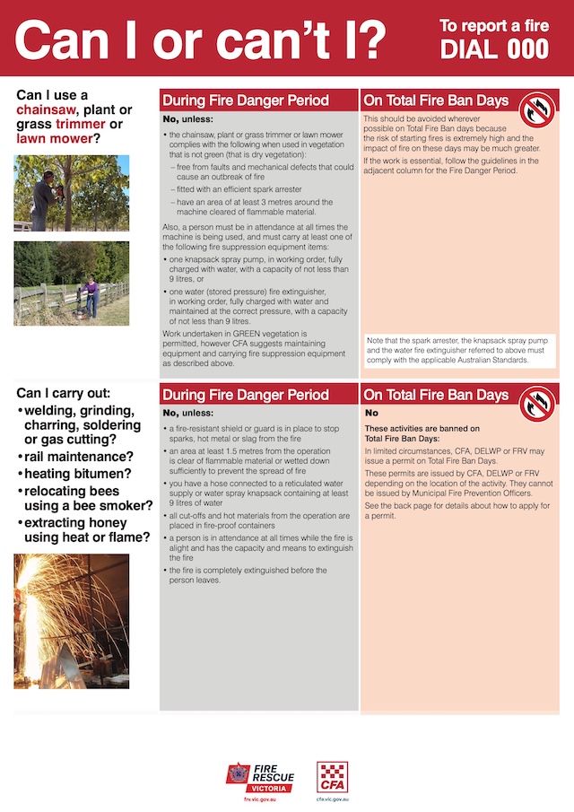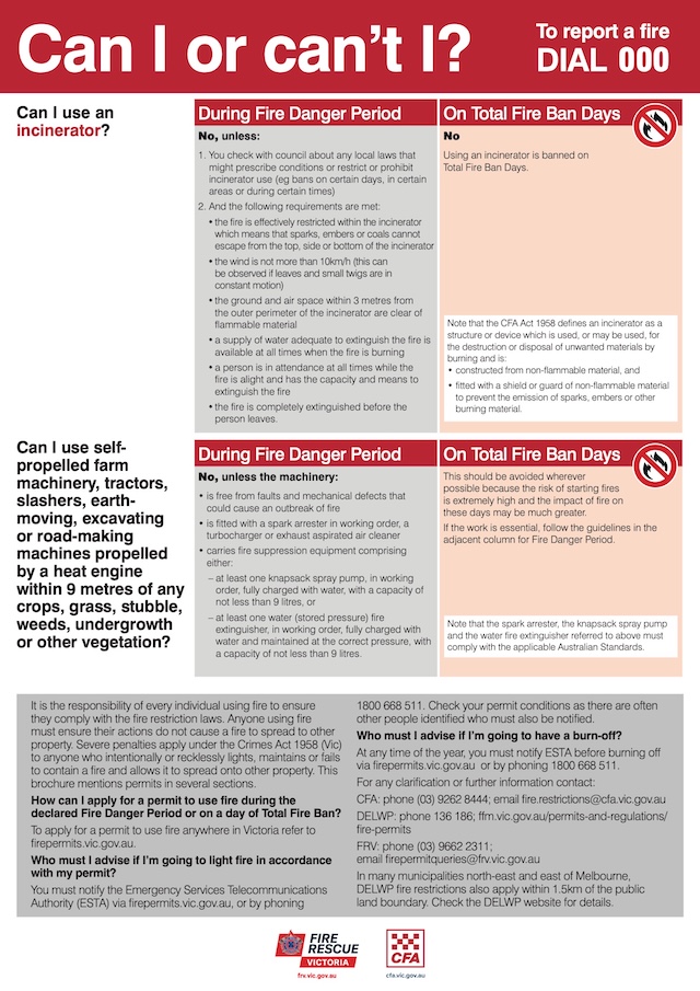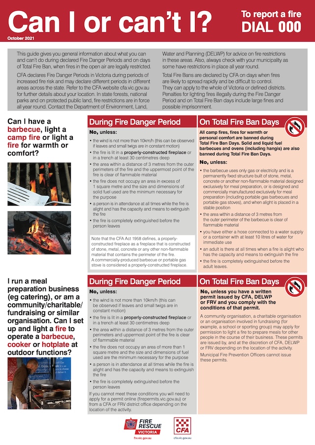 Check the CFA website for the current fire weather and relevant authoritative rules.