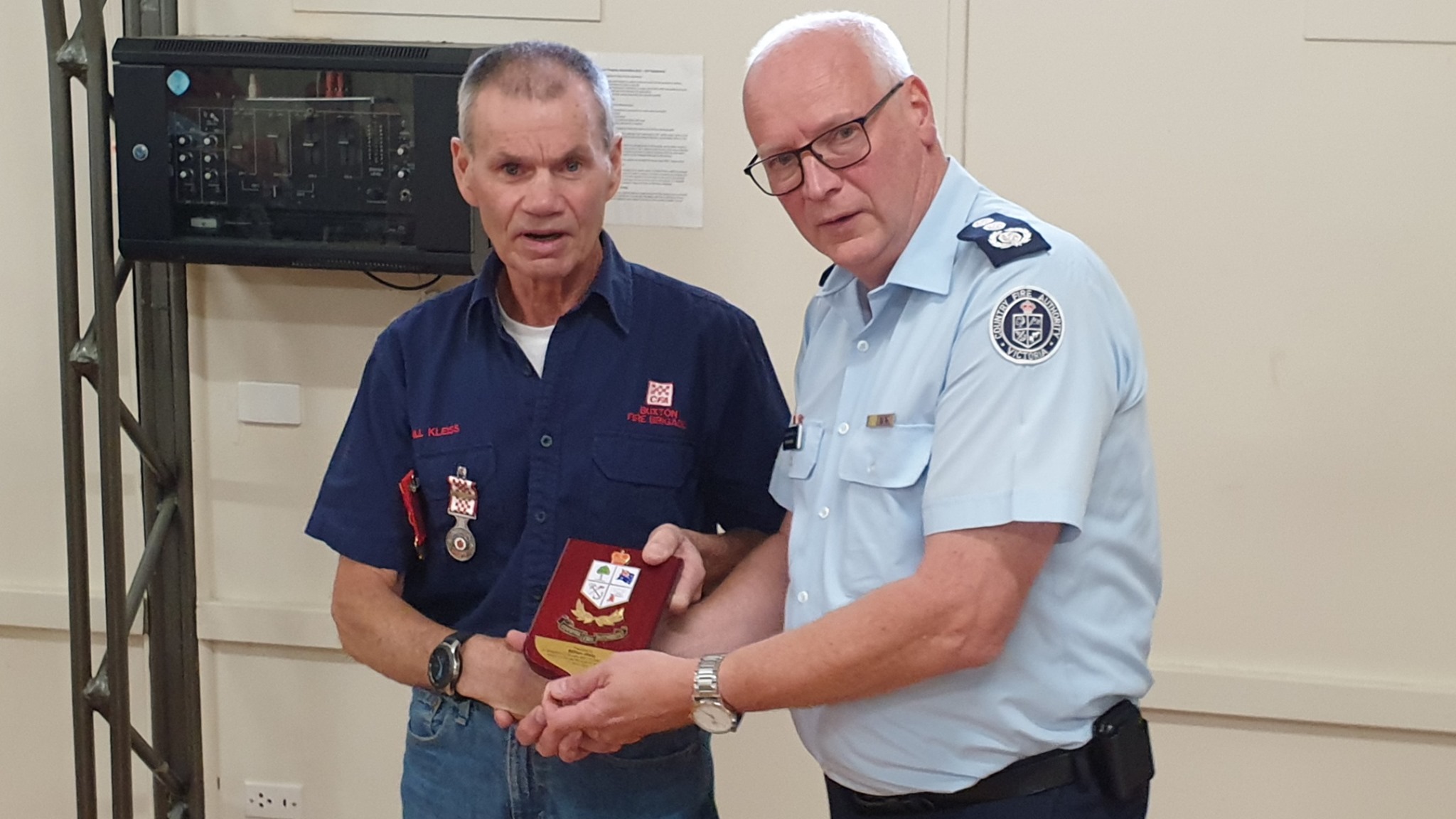 Captain Carlton read a short precise of their service to three communities and, specifically, the impact they have had on the Buxton Fire Brigade. Matt presented Bill with Life Membership of the brigade in recognition of the extraordinary contribution he has made during his time at Buxton. In 2019, Bill was also recognised by Shoreham with Life Membership of that brigade.