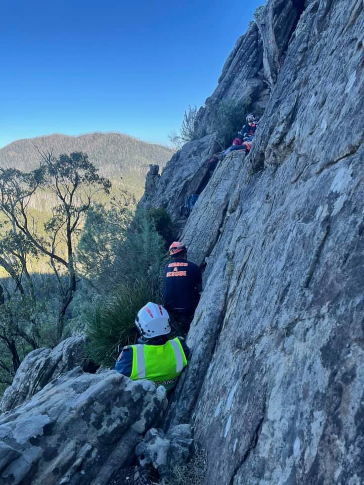 Great photos from the Marysville SES team from the incident scene. As indicated in the attached Post, the number of hikers on the peak was unbelievable and created additional risks for the SES crews on scene. It was disappointing to have to deal with others at the bottom who wanted to climb despite being told that a rescue was in progress.