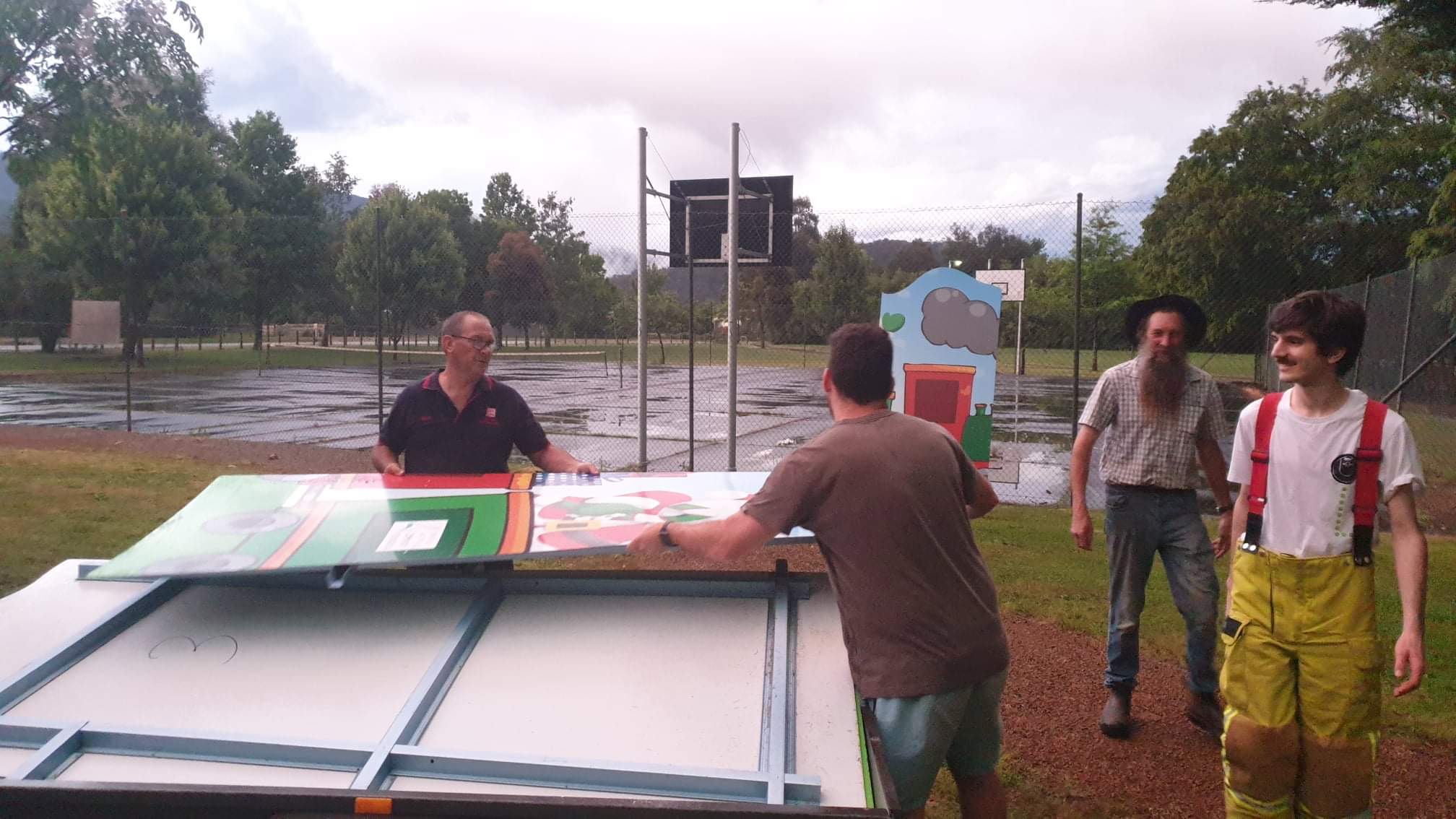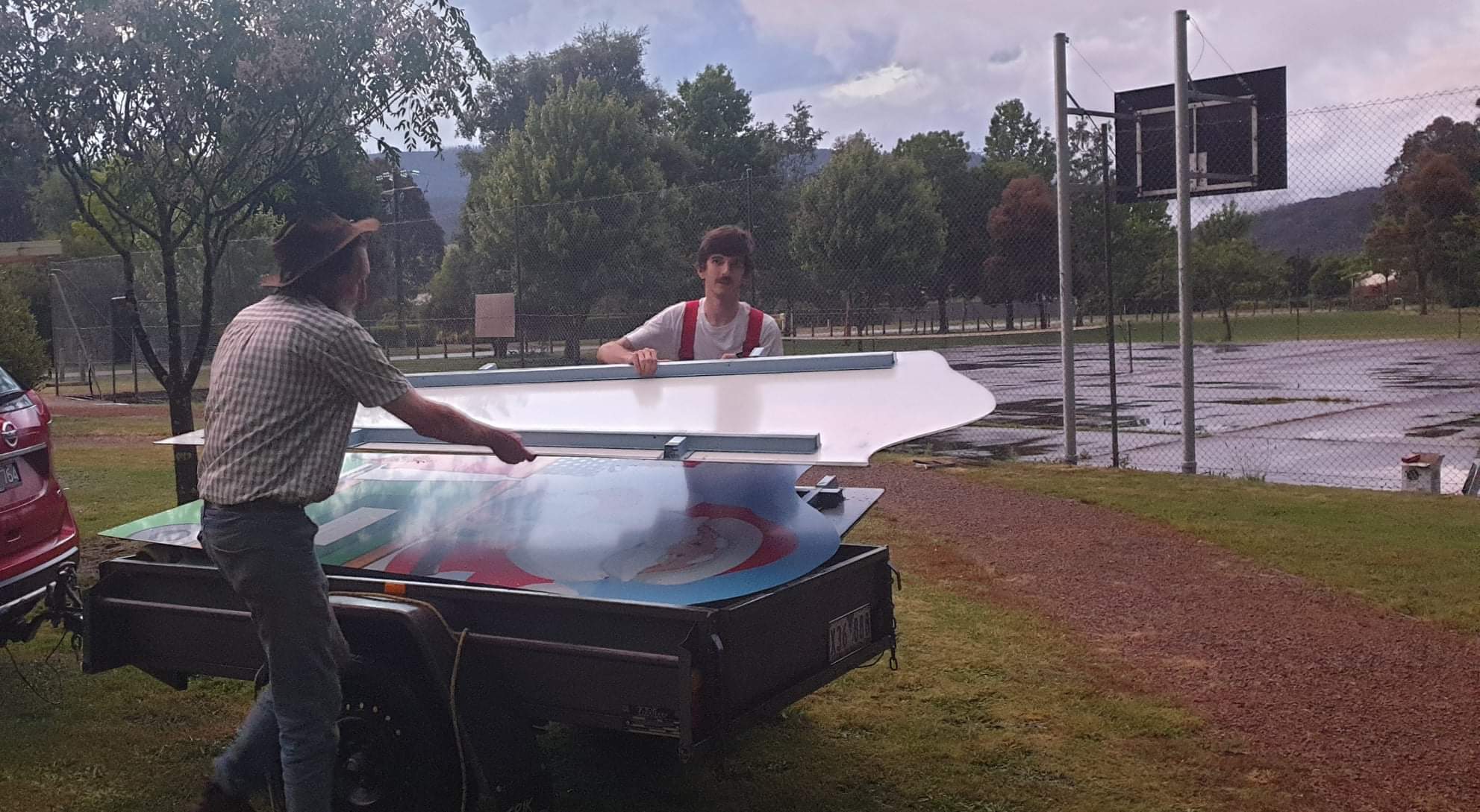 Once the initial storm had passed we decided to push on and make a start; just to have the pagers go off for a fire call in Marysville. While the operational members bolted over to the station, the others headed up to the Buxton Memorial Hall to collect the decorations. Fortunately the call to Marysville was a false alarm and everyone joined up at the hall to get the panels loaded.