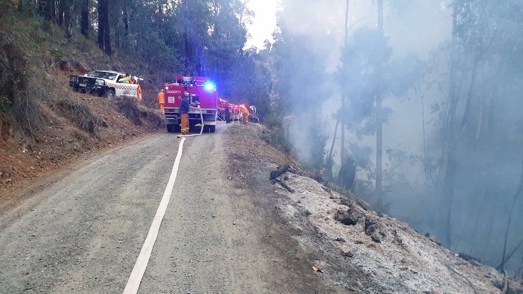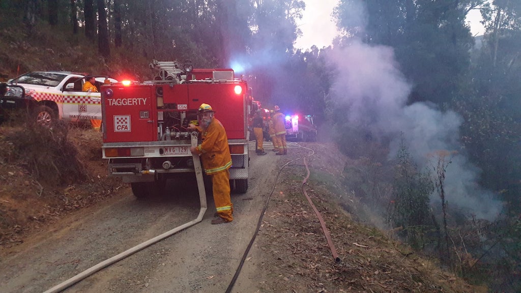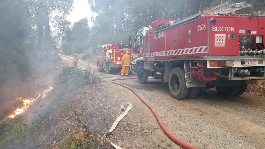 FFMV Duty Officer Tom Goldstraw attended and inspected the fire with the Incident Controller. It was then decided to employ a number of FFMV crews to create a mineral earth break around the fire. In the meantime, CFA crews continued to contain the fire with Narbethong and Taggerty supplying water to Buxton and Marysville. Once the FFMV crews were on scene the Marysville, Narbethong and Taggerty crews were released and Buxton remained to assist FFMV.