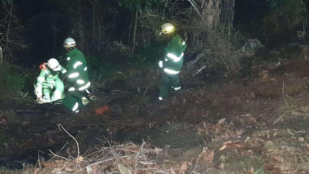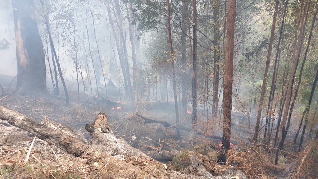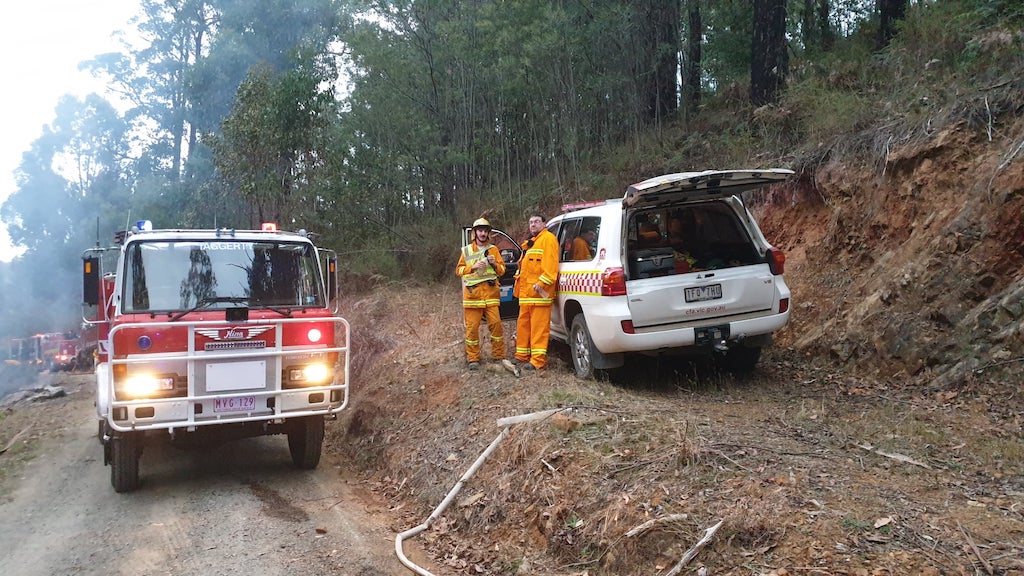 Crews from Marysville and Buxton set about cutting the fire off on both sides by advancing hose lines down from the track. Once the fire had been pulled up it was possible to review the situation and develop a plan to overhaul the area. Due to the steep nature of the site, a request was made for assistance from Forest Fire Management Victoria crews. Initially it was thought machinery would be required to deal with the difficult conditions.