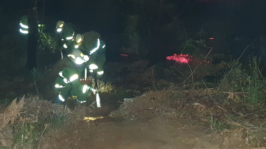 Once on scene, Buxton Tanker 2 made contact with the property owner who provided details of the area and helped with the initial formulation of an action plan. Lt Isaac Sims, from Buxton, assumed the role of Incident Controller. The fire resulted when sparks from a grinder ignited nearby vegetation which then spread to thick scrub, in extremely steep terrain, and a pile of logs along the driveway into the residence. The fire was spreading sideways and downhill when the first appliances arrived.