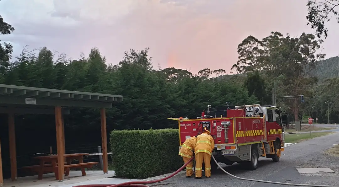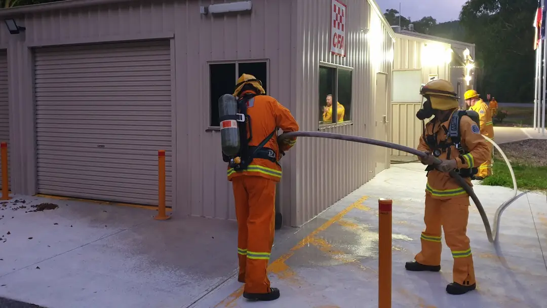 The CABA trainees tonight comprised a member from Buxton and a member from the Acheron brigade. The crews were set a scenario where a couple of rubbish bins were on fire at the rear of a commercial property. Tanker 2 had arrived first followed by Tanker 1 with the breathing apparatus crew.