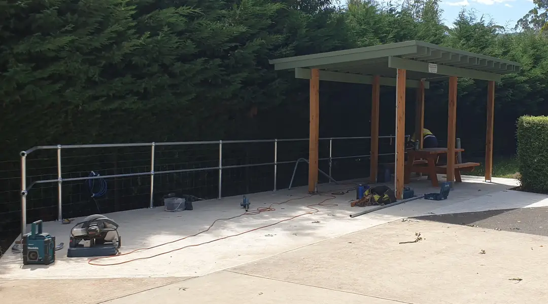 Last week, Josh and Stuart from E-Tec - Electrical Technology ran power to the gazebo giving us a powerpoint and lights switched from the station. Yesterday, Chris and the team from Alexandra Stainless installed a safety rail to the edge of the concrete slab.