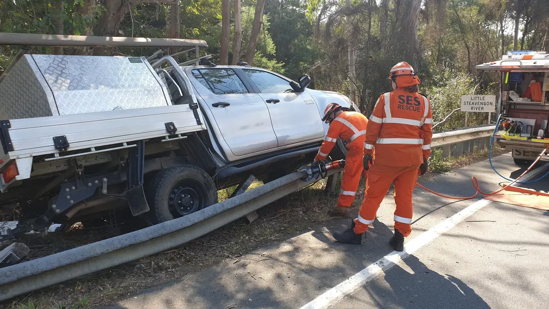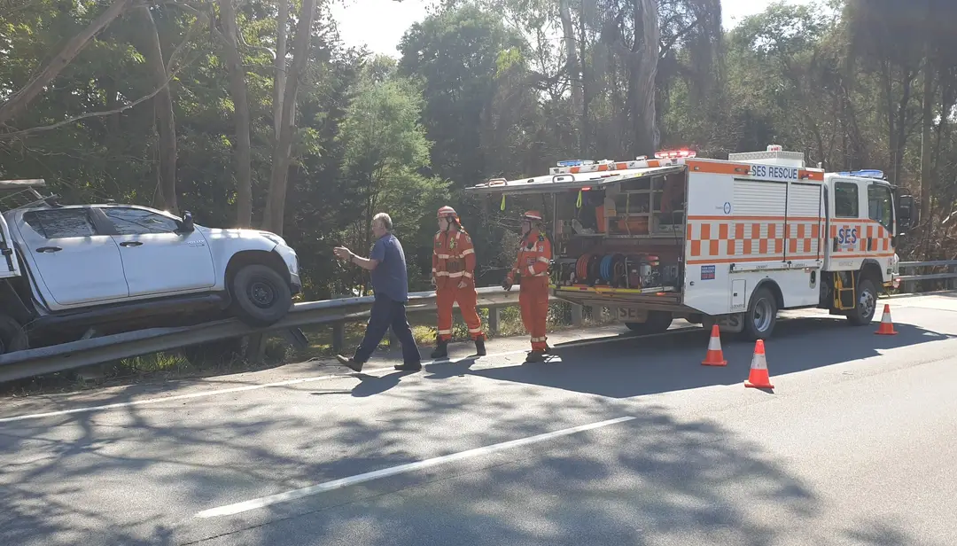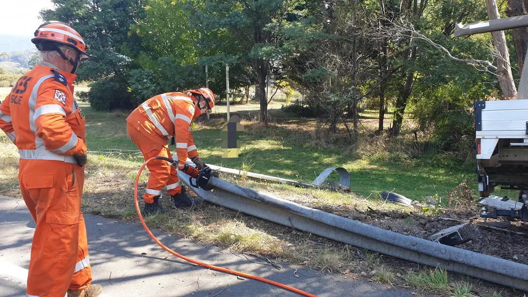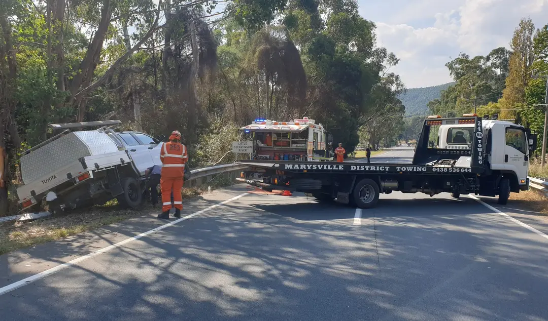 Fortunately the driver was unhurt and was helped from the vehicle by other motorists and staff from the nearby Buxton Trout and Salmon Farm. Upon our arrival, the vehicle was made safe and Police and Towing requested. An assessment with Marysville District Towing identified a need to cut and remove the armco. SES Marysville Unit was requested to undertake the task of removing the armco.