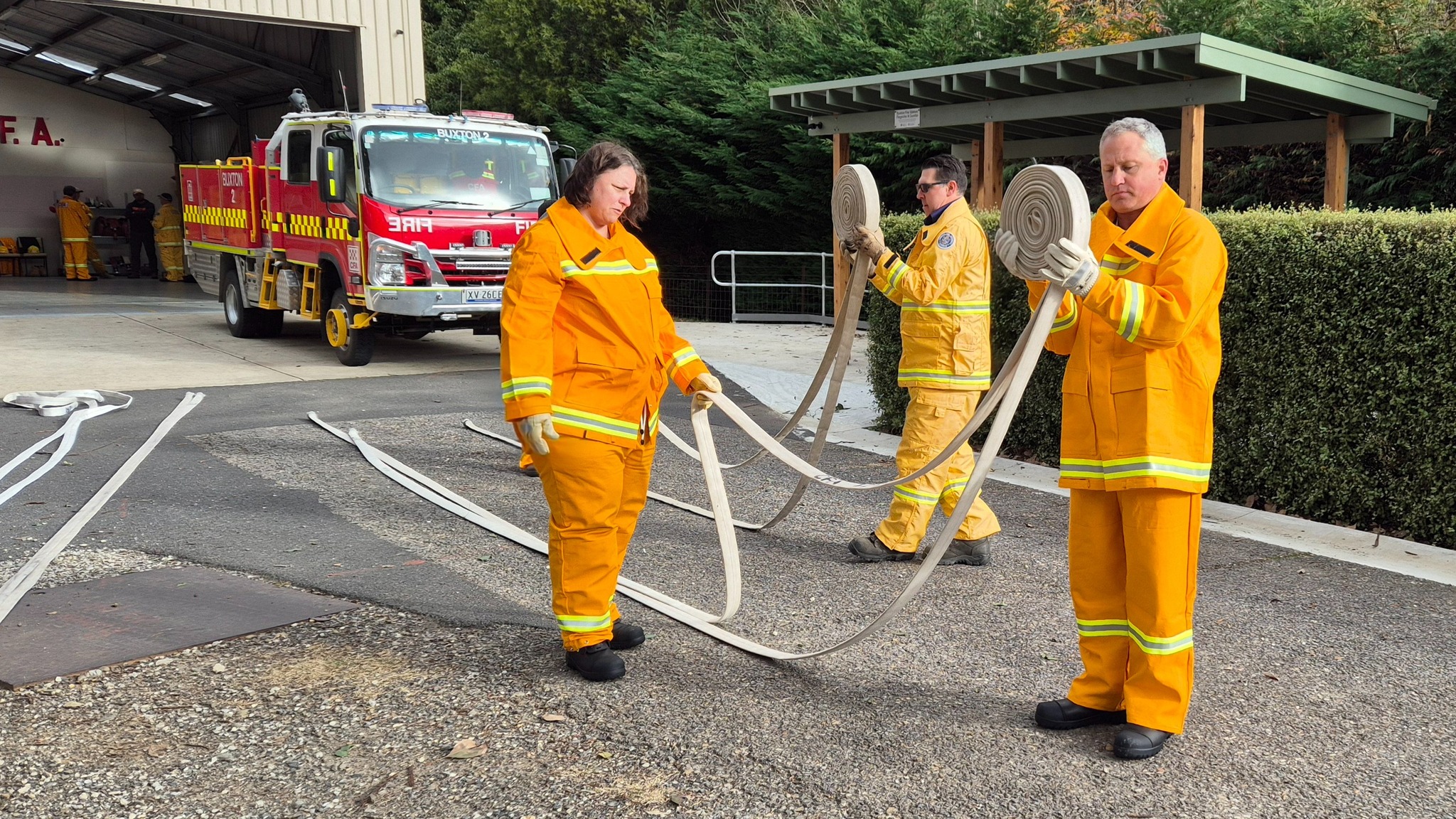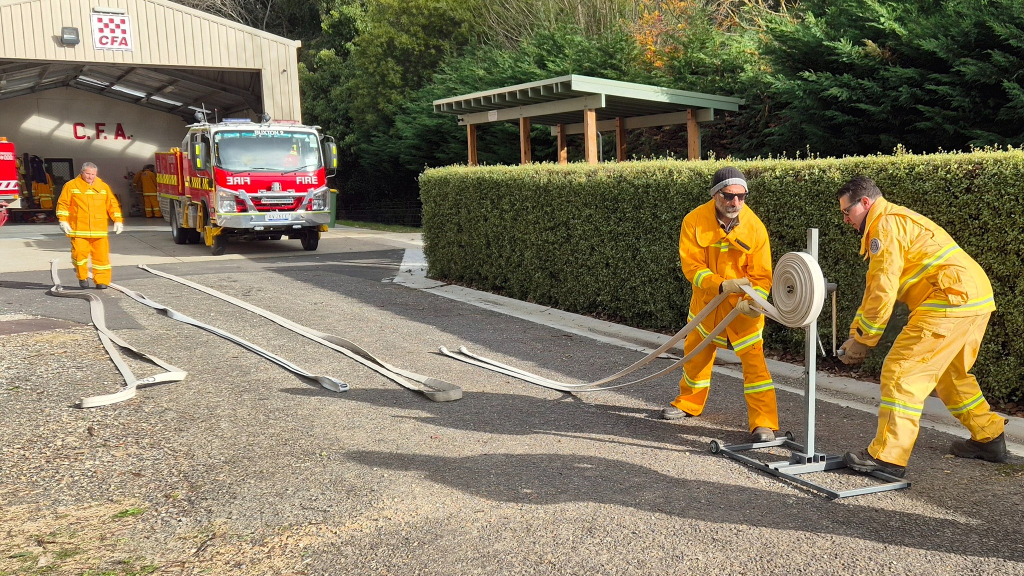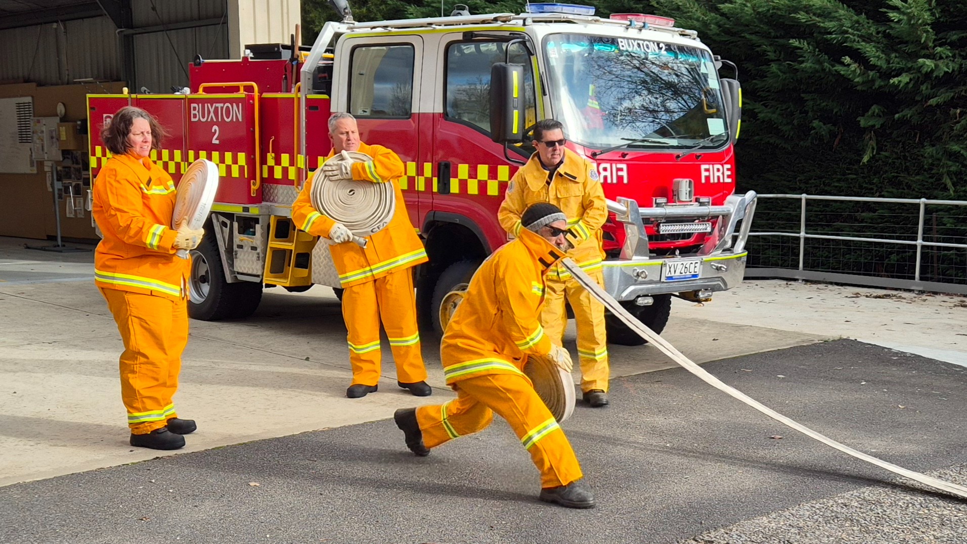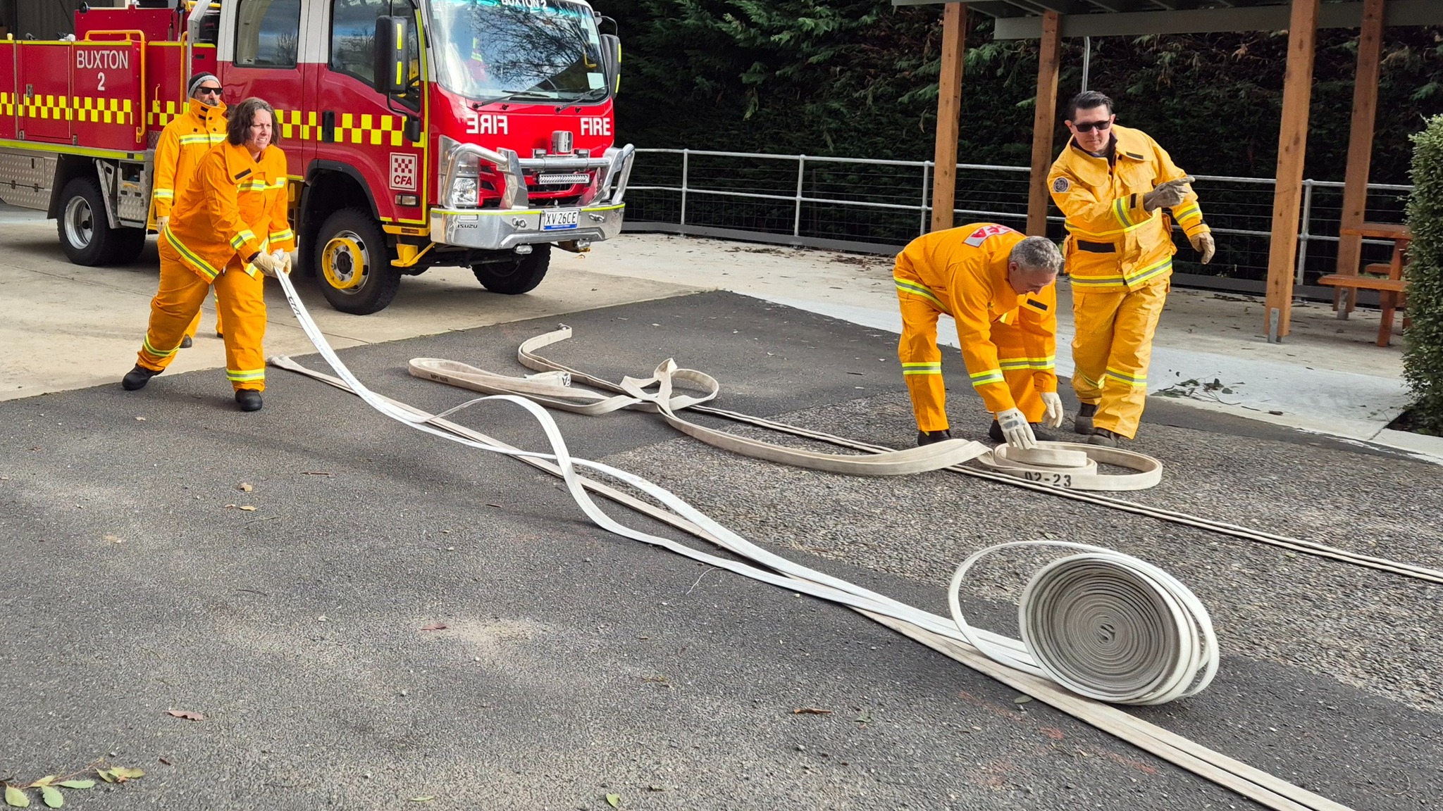 The recruits (some of whom are still in the process of being allocated their bushfire protective clothing) completed drills on radio operations, hose deployment, water delivery, and pump operations. This morning was one of three practical sessions offered, as part of the block course, to cover the mandatory practical drills and brigade familiarisation tasks in a group learning environment.
