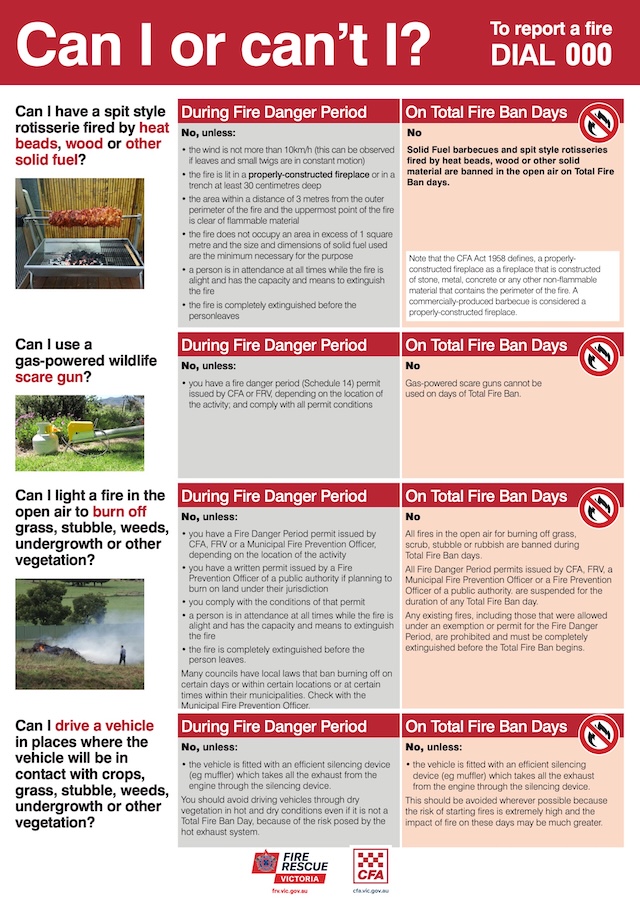 Check the CFA website for the current fire weather and relevant authoritative rules.
